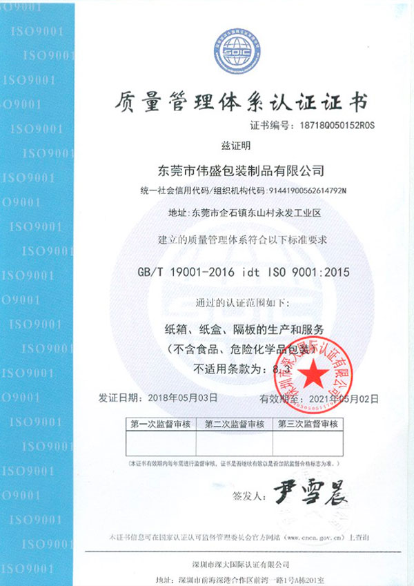 东莞市伟盛包装制品有限公司成立于2010年,已通过ISO9001质量体系和ISO14001环境体系认证,公司占地面积5000平方米,十几年的发展,公司一直致力于纸箱、纸盒、啤盒、彩盒、飞机盒等纸制品,广泛应用于电子,家私、工艺品、灯饰、五金、塑胶等产品的包装上,欢迎新老客户致电垂询。